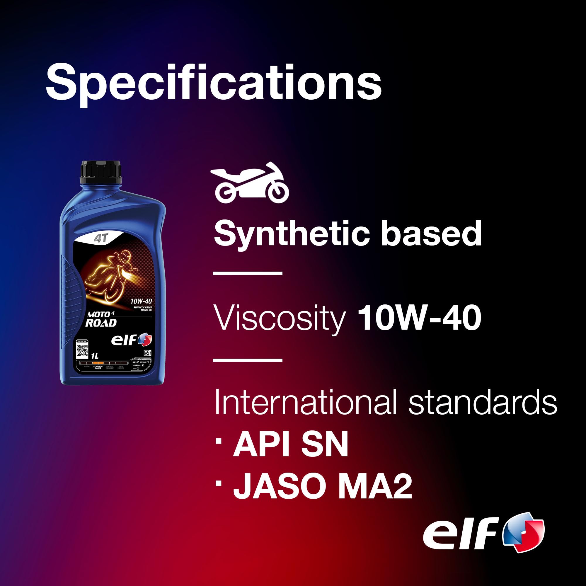 - ELF MOTO 4 ROAD 10W-40 is synthetic based 4-stroke motorcycle engine oil for modern high-performance sports bikes