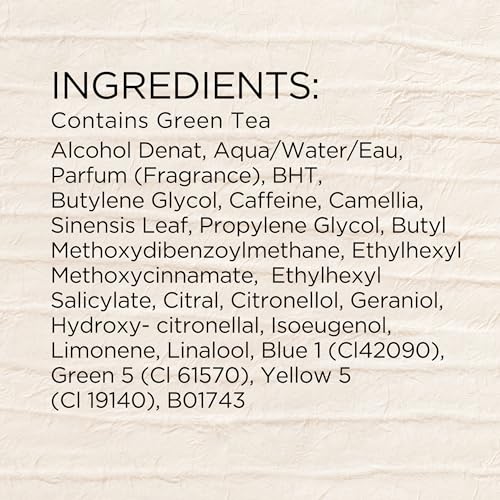 Alcohol Denat, Water/Aqua/Eau, Parfum Fragrance, Camellia Sinensis Leaf Extract, Propylene Glycol, Butylene Glycol Bht, Citral, Citronellol, Geraniol, Hydroxycitronellal, Hydroxyisohehyl 3-Cyclohexene Carboxaldehyde, Isoeugenol, Limonene, Linalool, Butyl Methoxydibenzoylmethane, Ethylhexyl Methoxycinnamate,Ethylhexyl Salicylate Green 3 (Ci 42053),Yellow 5 (Ci 19140).