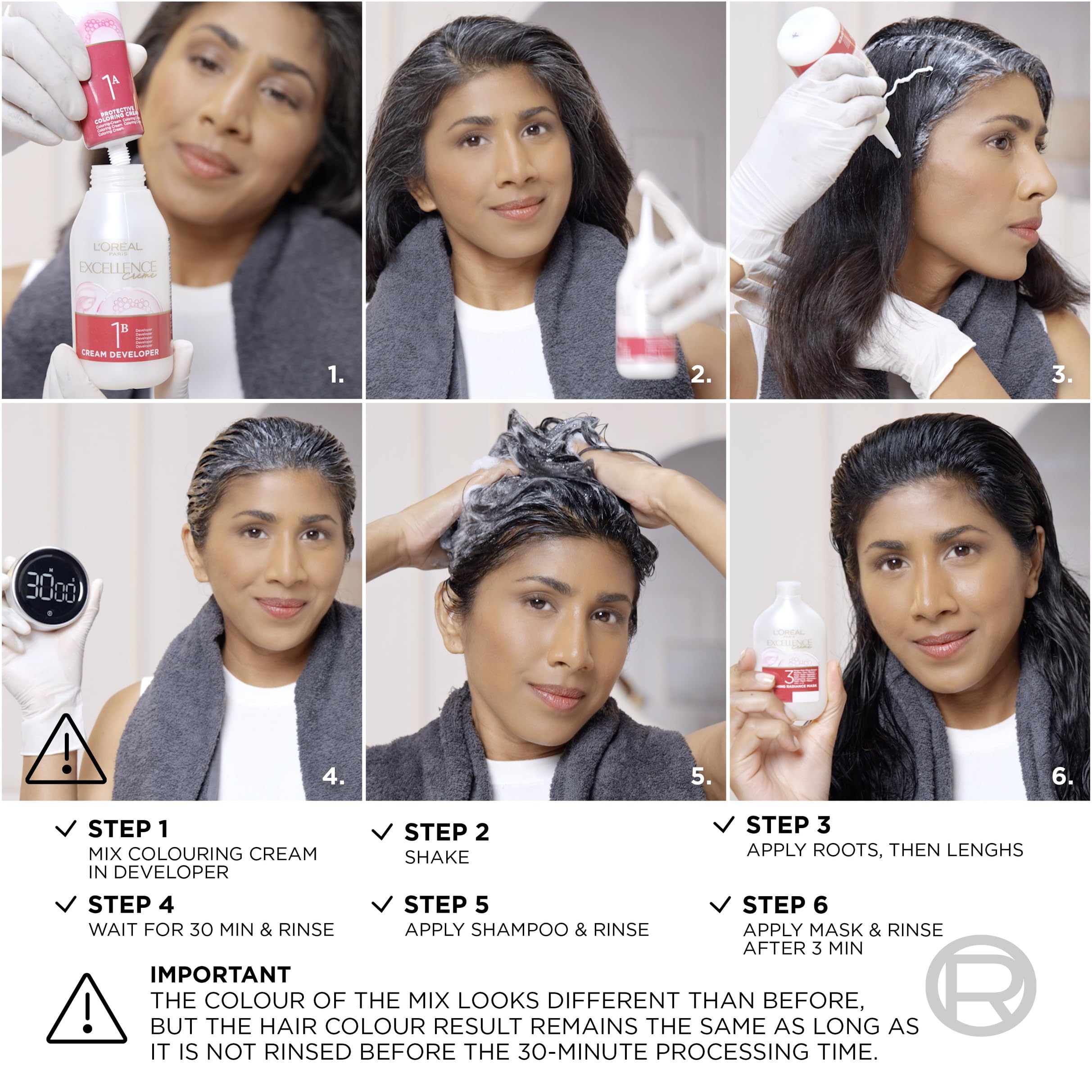 - Read instructions and patch test 48 hours before use: 1.) Use gloves and pour colouring into developer bottle and shake to mix, 2.) Apply colour and leave for recommended time, 3.) Shampoo out and follow with conditioning mask