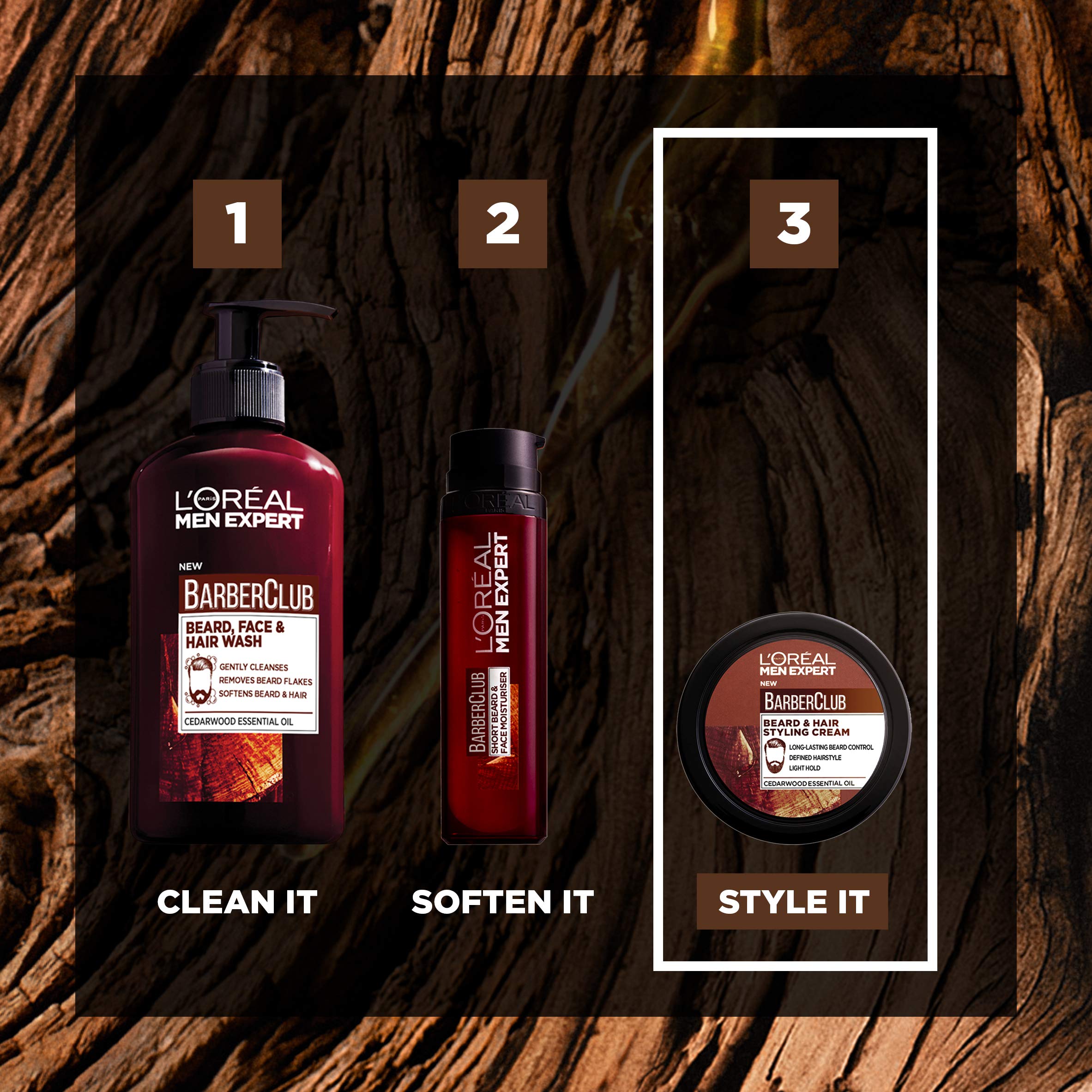 L’Oréal Paris Men Expert Barber Club. For the daily style of beard, discover the barber club beard and hair styling cream formulated with cedar wood essential oil. Ideal for all day beard control and hairstyle definition. The Barber’s Tips – How to Use 1. Work the product between hands and apply to dry or towel dried hair. 2. Use a comb to set the hair in place.