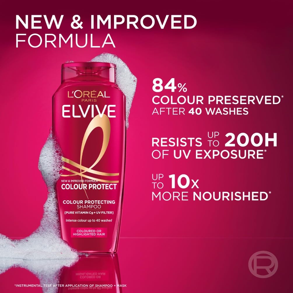 Coloured or Highlighted hair? Preserve the intensity and vibrancy of your first-day colour for up to 40 washes* with Elvive Colour Protect Shampoo by L’Oréal Paris. The formula is powered with [Pure Vitamin Cg** + UV Filters] to help protect your colour and shield your hair against UV aggressors. The result? Hair colour appears vibrant and radiant for longer, with 84% of hair colour preserved even after 40 washes and 200 hours of UV exposure*. What makes it effective? Pure Vitamin Cg**, known for its powerful antioxidant properties in skincare, is now available for your hair. Exposure to UV rays, heat styling, and even washing can cause coloured hair to fade and lose its shine. Elvive Colour Protect Shampoo, helps maintain colour vibrancy and protect your hair, leaving it looking healthier and more radiant. Suitable for all hair types and textures, whether your hair is straight, wavy, curly, or coily. *instrumental test shampoo + conditioner. **vitamin c derivative