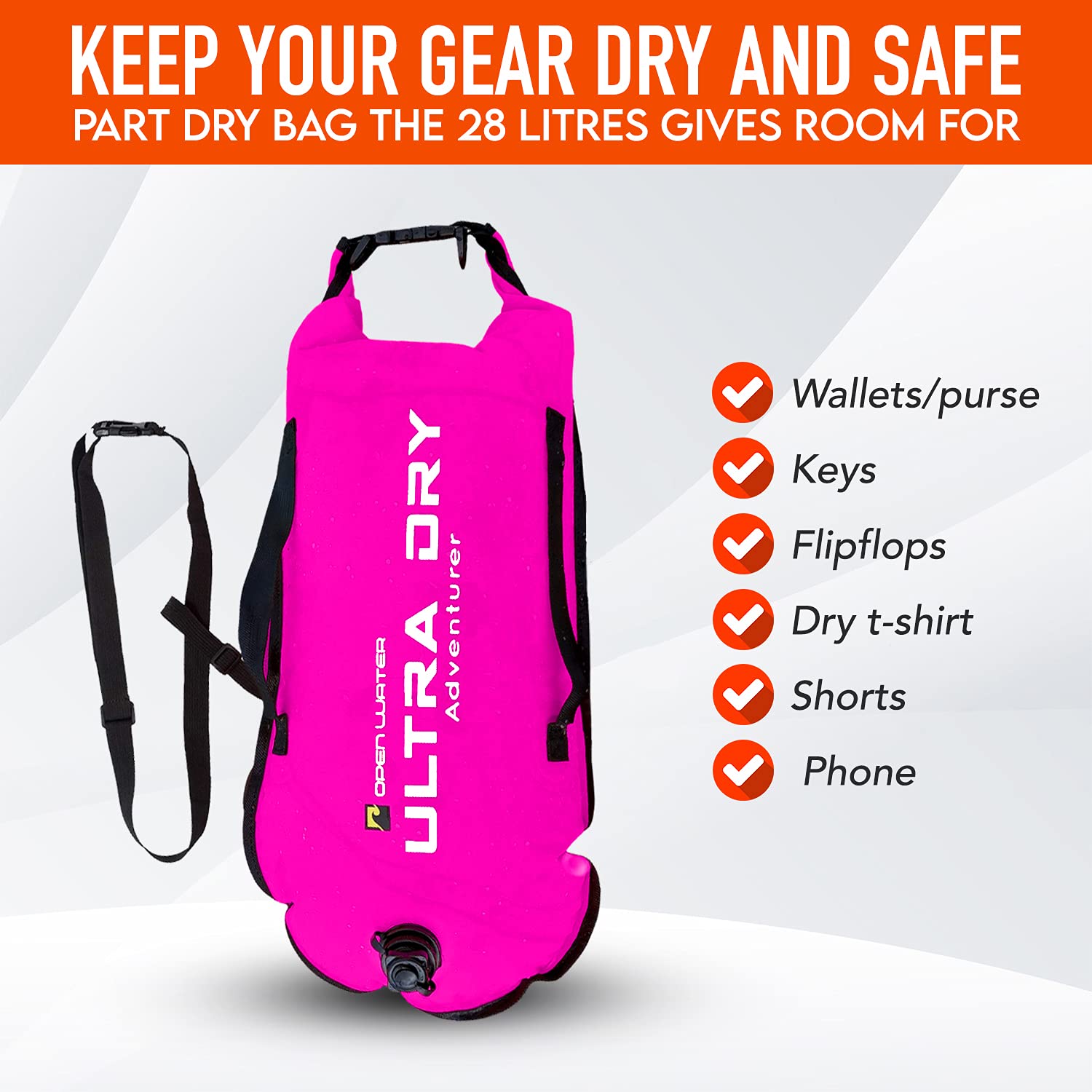 • KEEP YOUR GEAR DRY AND SAFELY WITH YOU WHILE SWIMMING, Part Dry Bag, the 28 litres gives Room for Wallets/purse, keys, flipflops, dry t-shirt, shorts, and phone in the waterproof case provided.