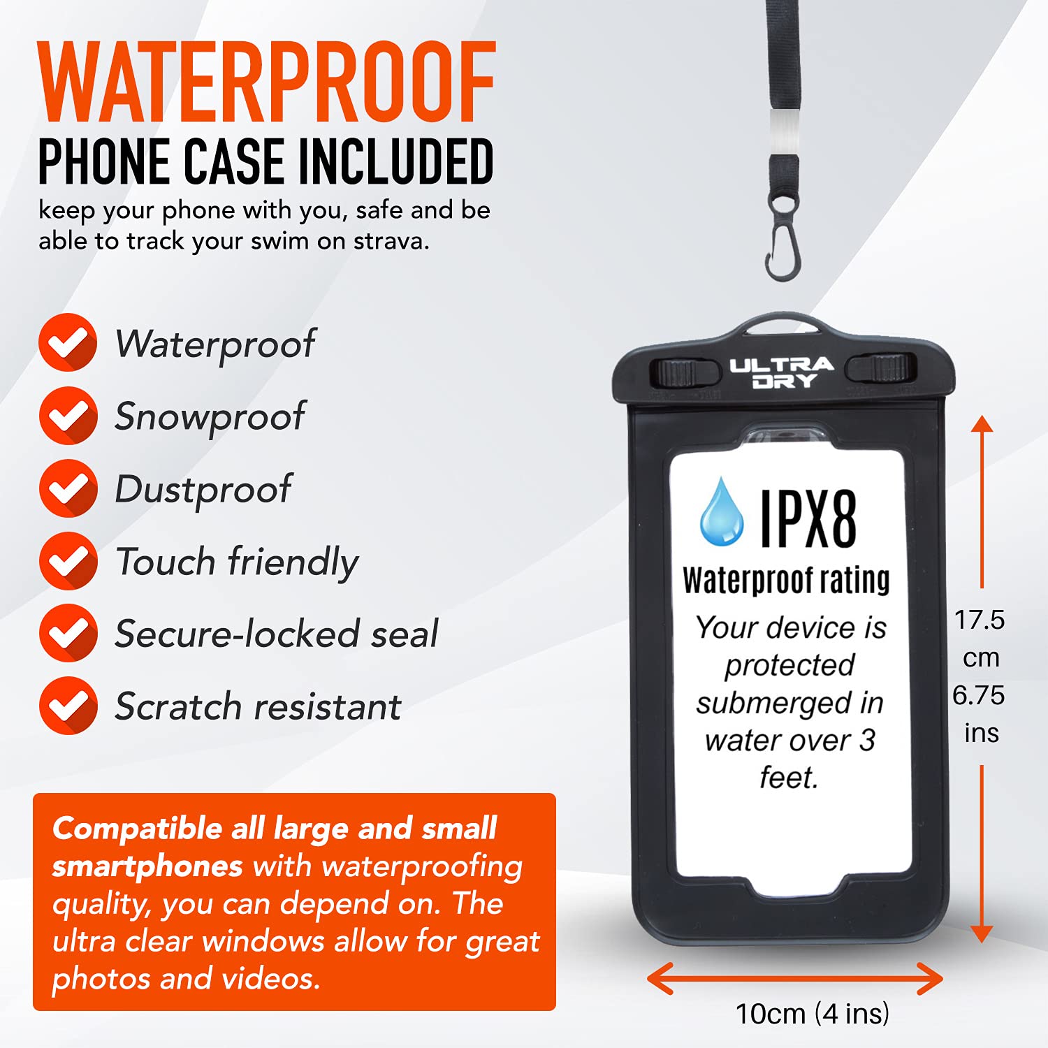 • PREMIUM WATERPROOF PHONE CASE INCLUDED, keep your phone with you, safe and be able to track your swim on strava. This case is worth £7 alone and works superbly with all large & small smartphones with waterproofing quality you can depend on. The ultra clear windows allow for great photos and videos.