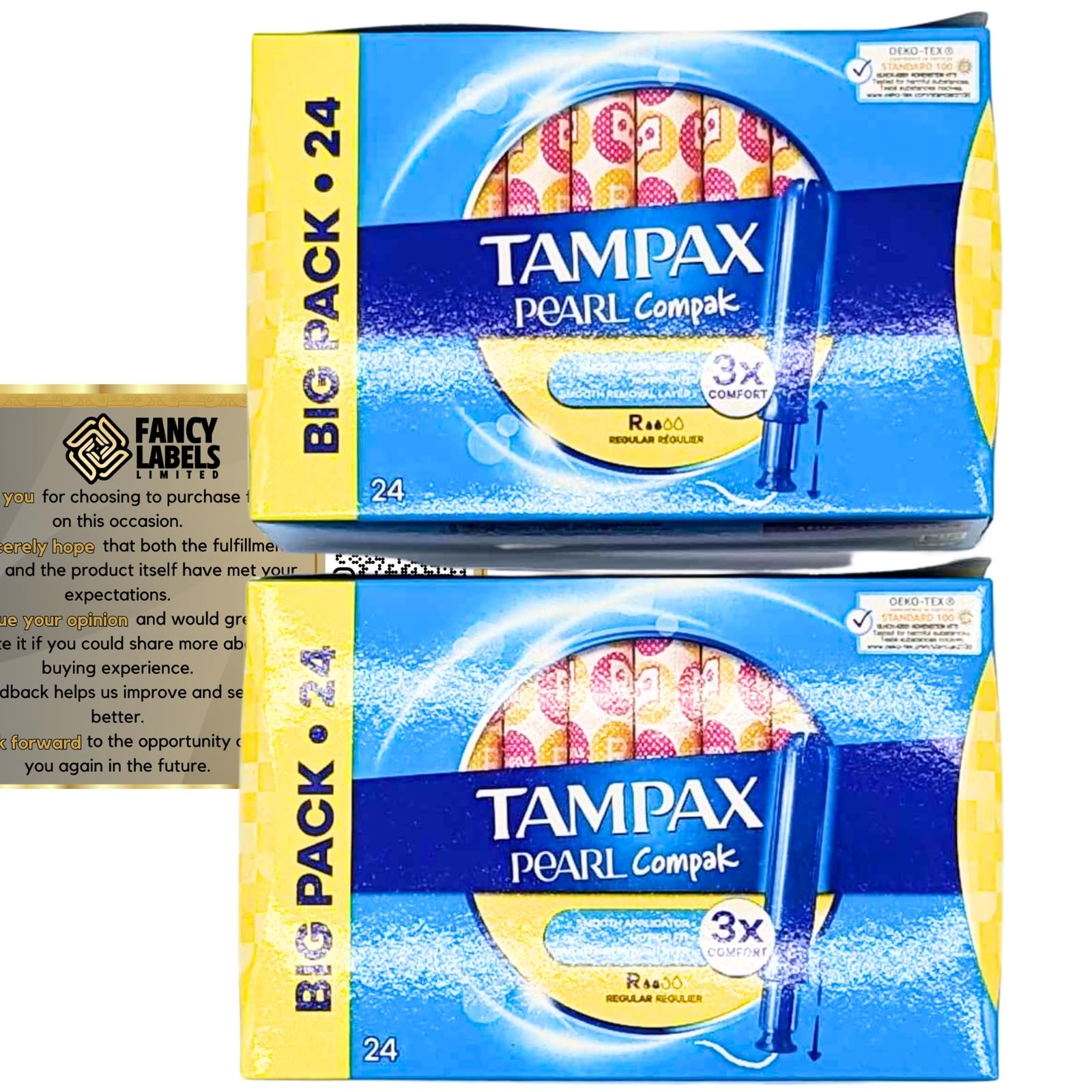 Tampons Multipack Bundle With 2x Tampax Compak Pearl Regular Tampons Applicator 24 count – 48 Total Count – Comfort, Protection And Discretion. These Bundles are enclosed within a Fancy Labels Non-transparent Bag, accompanied by a personalized Fancy Labels Thank You Card.