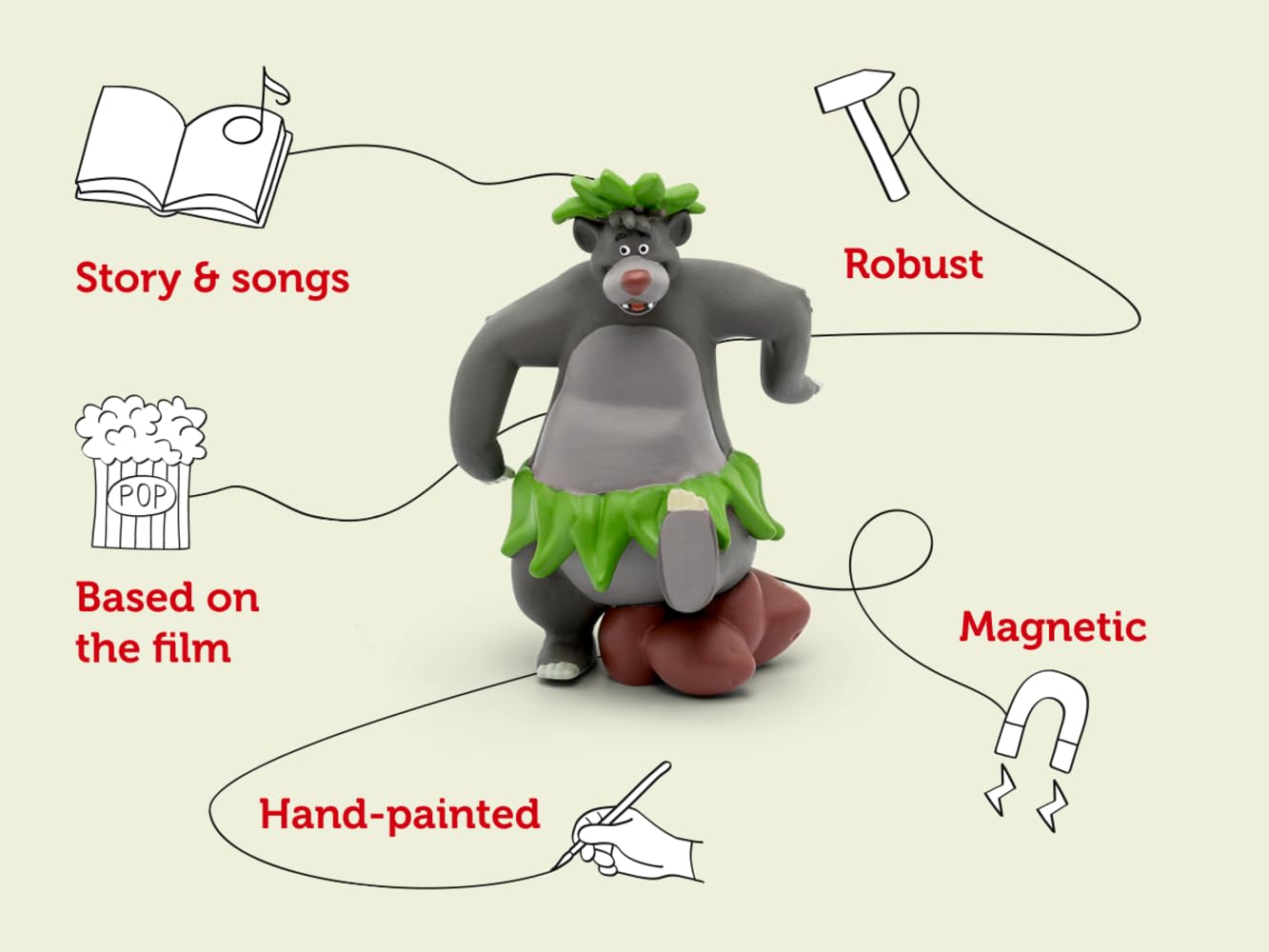 - Box contents: tonies Audio Character – Disney’s The Jungle Book 1 x audio character with audio history and song collection. 5 tracks. Requires Toniebox (sold separately)